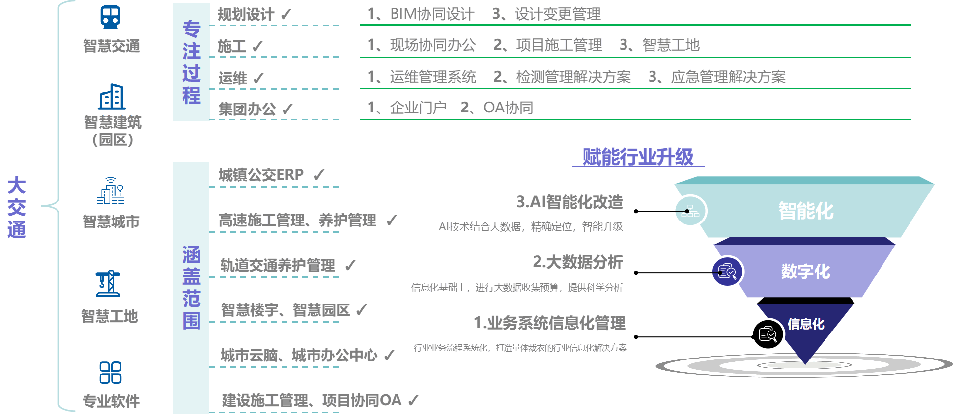 專注于大交通(土木,建筑,交通,材料)行業(yè)的核心應用系統(tǒng)定制開發(fā)以及信息化,數(shù)字化平臺開發(fā)。具有診斷、咨詢、設計、開發(fā)、測試、實施、維護的全流程業(yè)務能力,以及基于公司FF (V1.0)產(chǎn)品級解決方案的實施業(yè)績。